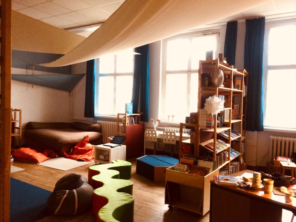Der Leseraum mit seinen insgesamt über 1.000 ausgewählten Bilder,- Kinder- und Jugendbüchern bietet Schüler*innen einen Ort, Lesen im entspannten und persönlichen Umfeld zu erfahren und einzuüben.