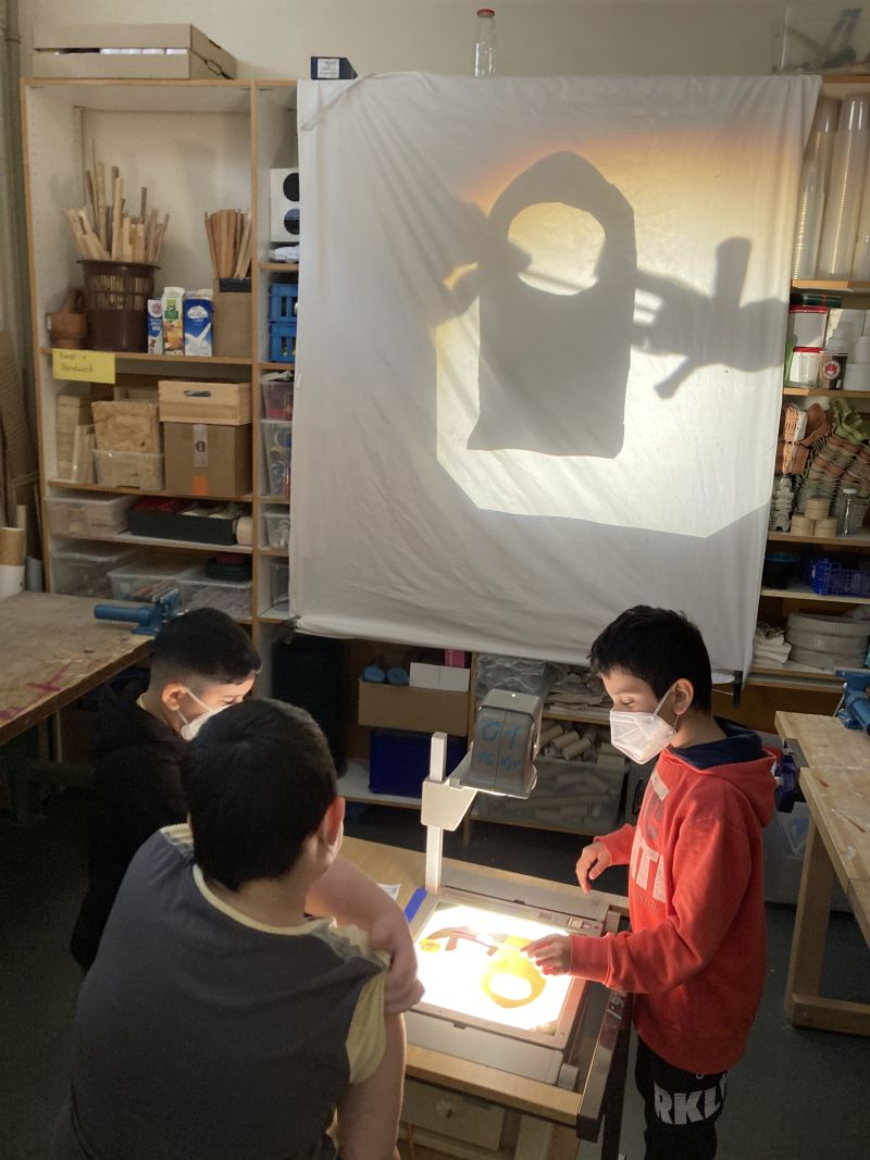 Am zweiten Tag probieren wir uns im Theaterspielen. Am Polylux erwecken wir Schattenfiguren zum Leben und können uns auch am Puppentheater überlegen, was wohl passiert, wenn sich eine Weltraumrakete plötzlich auf den blauen Planeten verirrt.